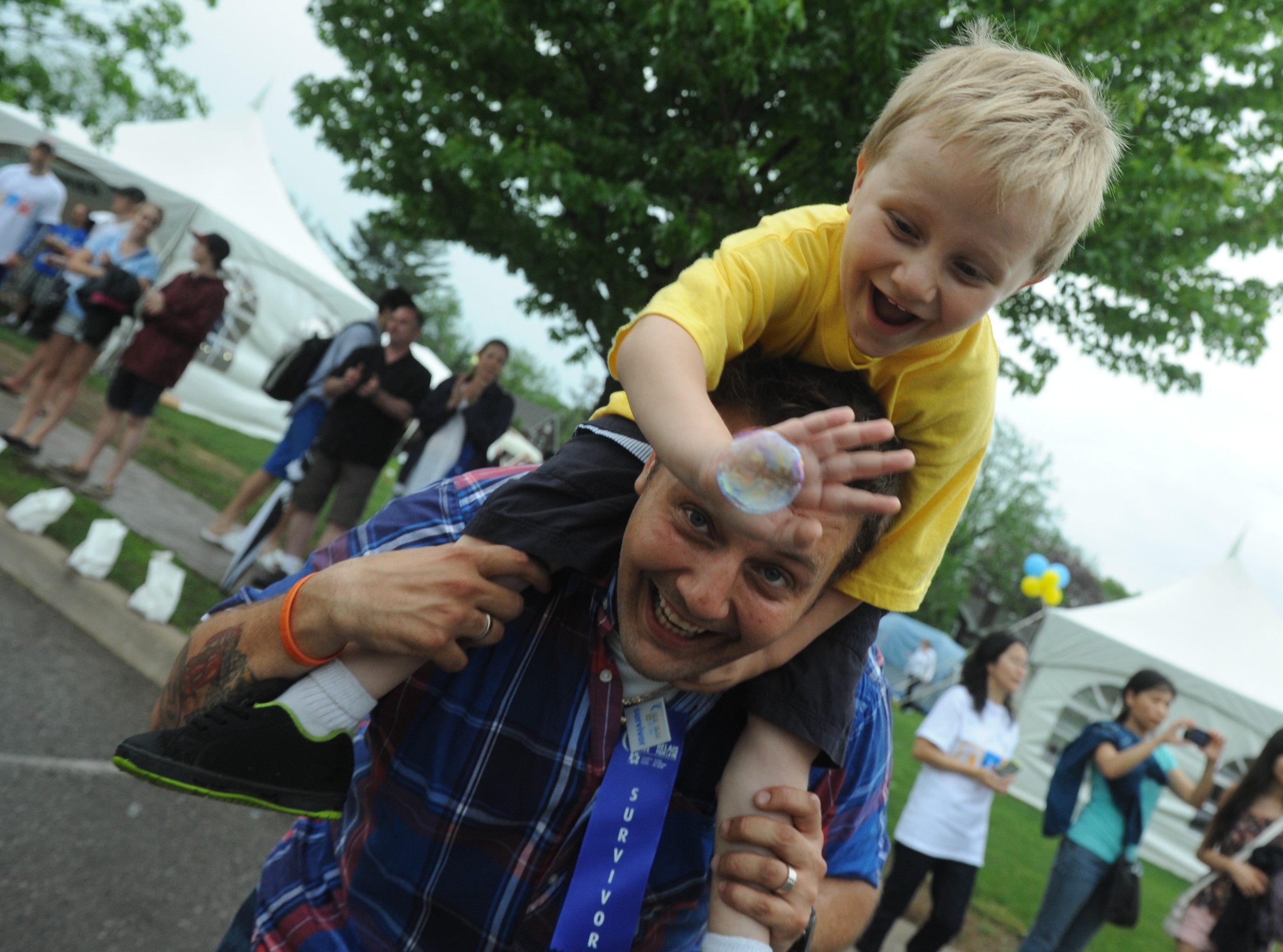 The Canadian Cancer Society’s Relay for Life was held in Oakville, at Appleby College. With participants camping on the field, and walking the track around the campus from 7pm to 7am. Here, Jaiden D’Ambrosio sits atop his father, Orlando’s shoulders, as he tries to pop a bubble.Eric Riehl/Metroland Media Group