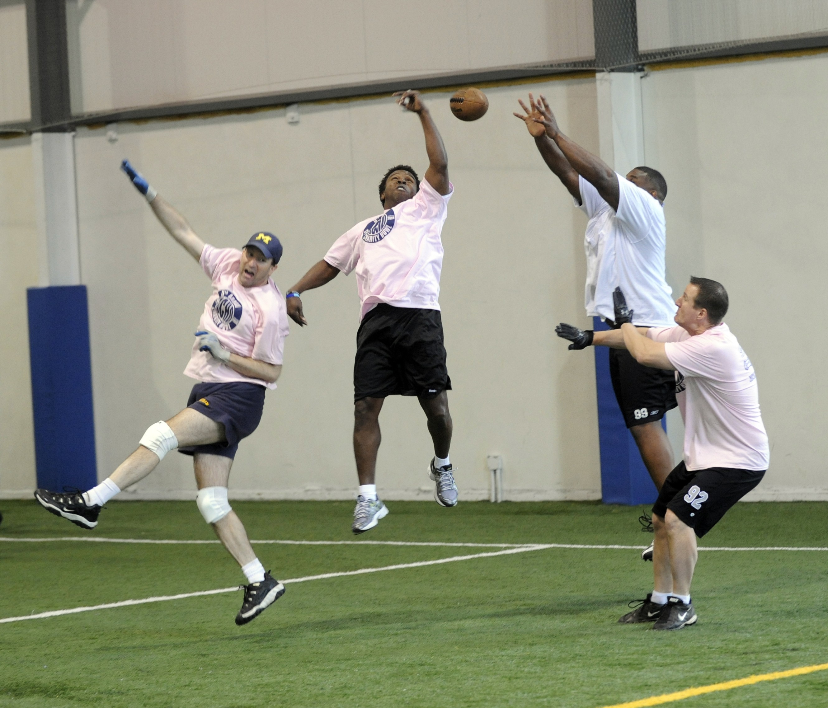 North Oakville Touch Football Association held their annual charity touch football tournament, the fifth annual Ocho Bowl. Football stars Michael Pinball Clemons, Damon Allen, Duane Butler and Wayne Smith each played with a team. Proceeds went to Michael Pinball Clemons Foundation.Here, Pinball jumps to block a throw meant for Wayne Smith (white).Eric Riehl/Metroland Media Group