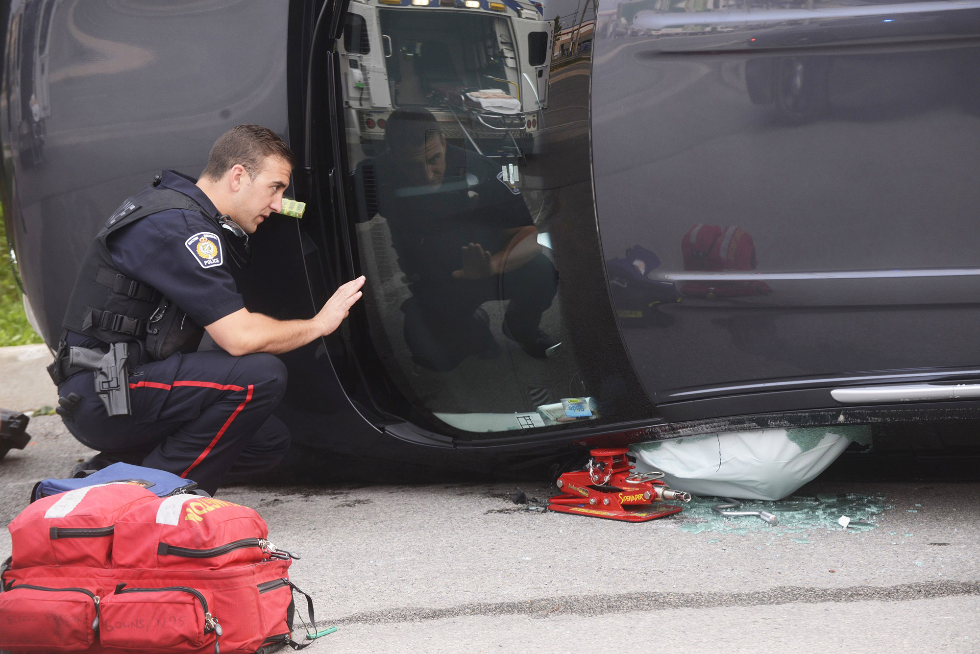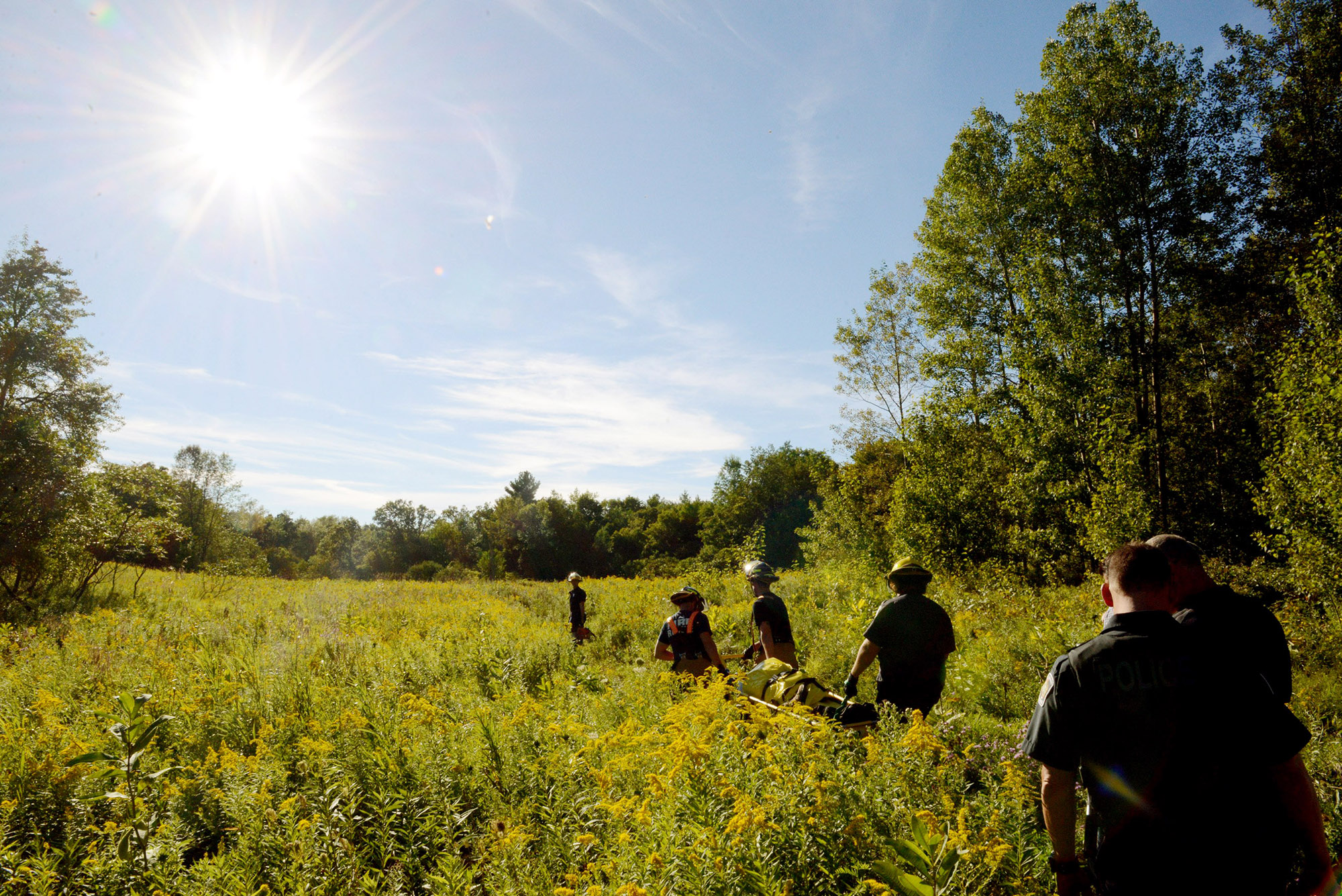 The Halton Regional Police investigation revealed that the 42 year old female victim lost balance near a lookout in an area on top of the escarpment, at Mount Nemo. Burlington Firefighters, followed by members of the Halton Regionl Police carry the victim away from the trail. Eric Riehl / Metroland Media Group