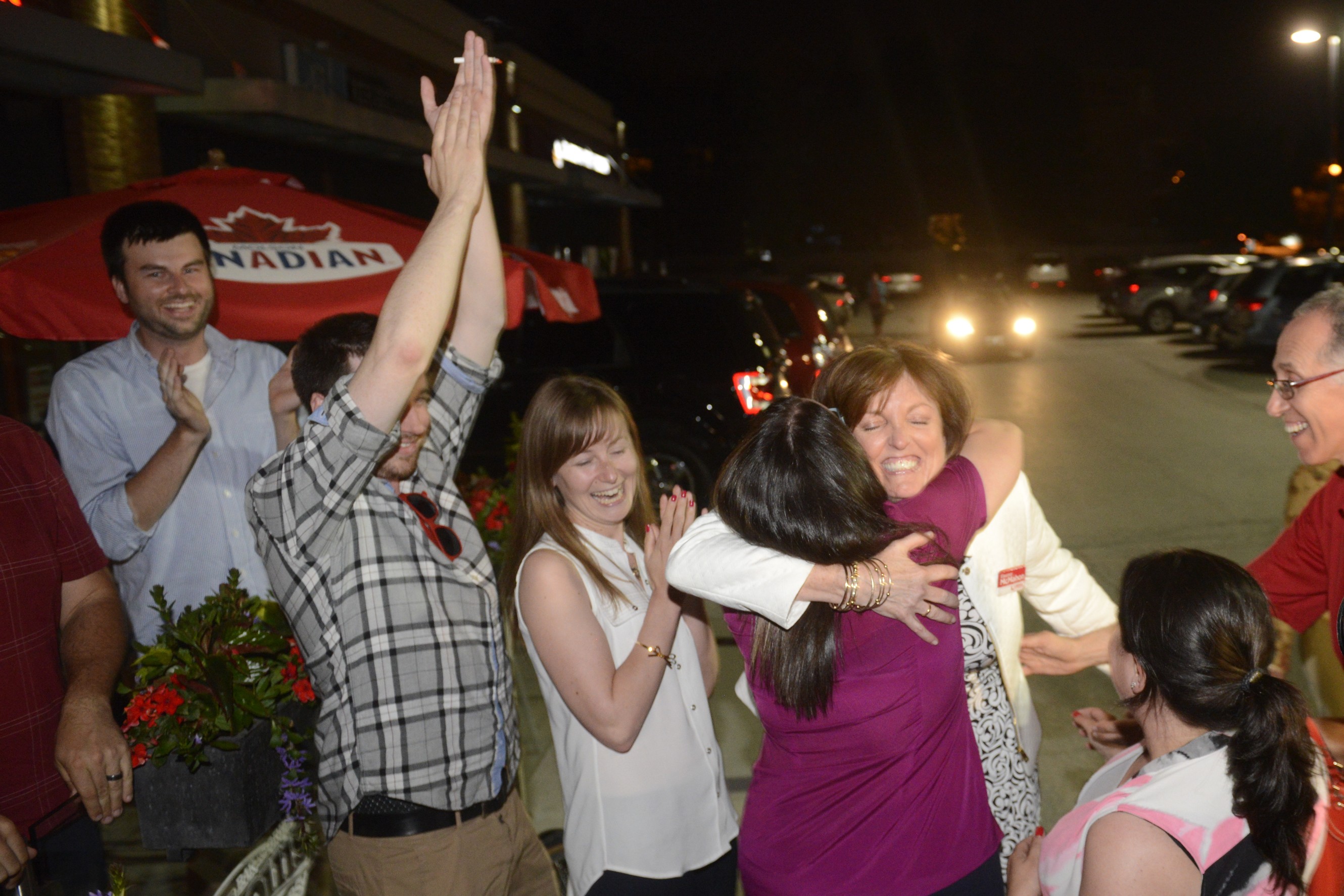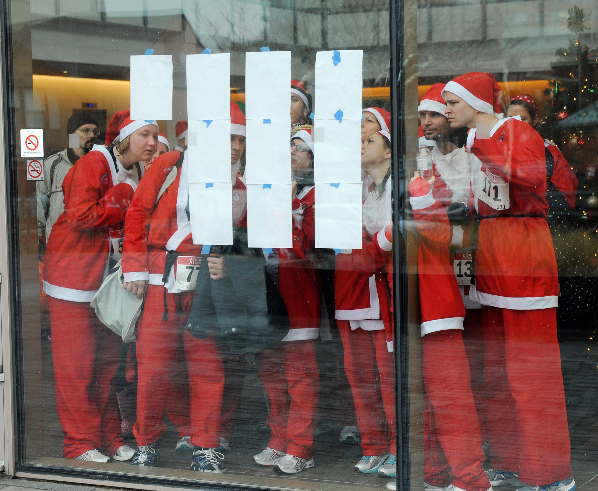 Burlington’s Santa 5k 2012 – around 4000 people dressed as Santa running through the streets of Downtown Burlington.Here, Santas huddle to check results of the race.Eric Riehl/Metroland Media Group